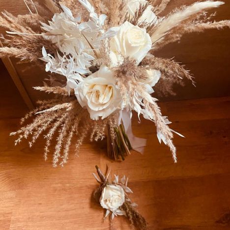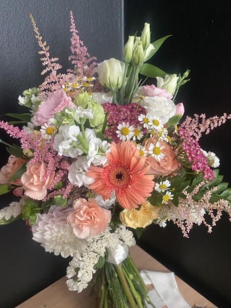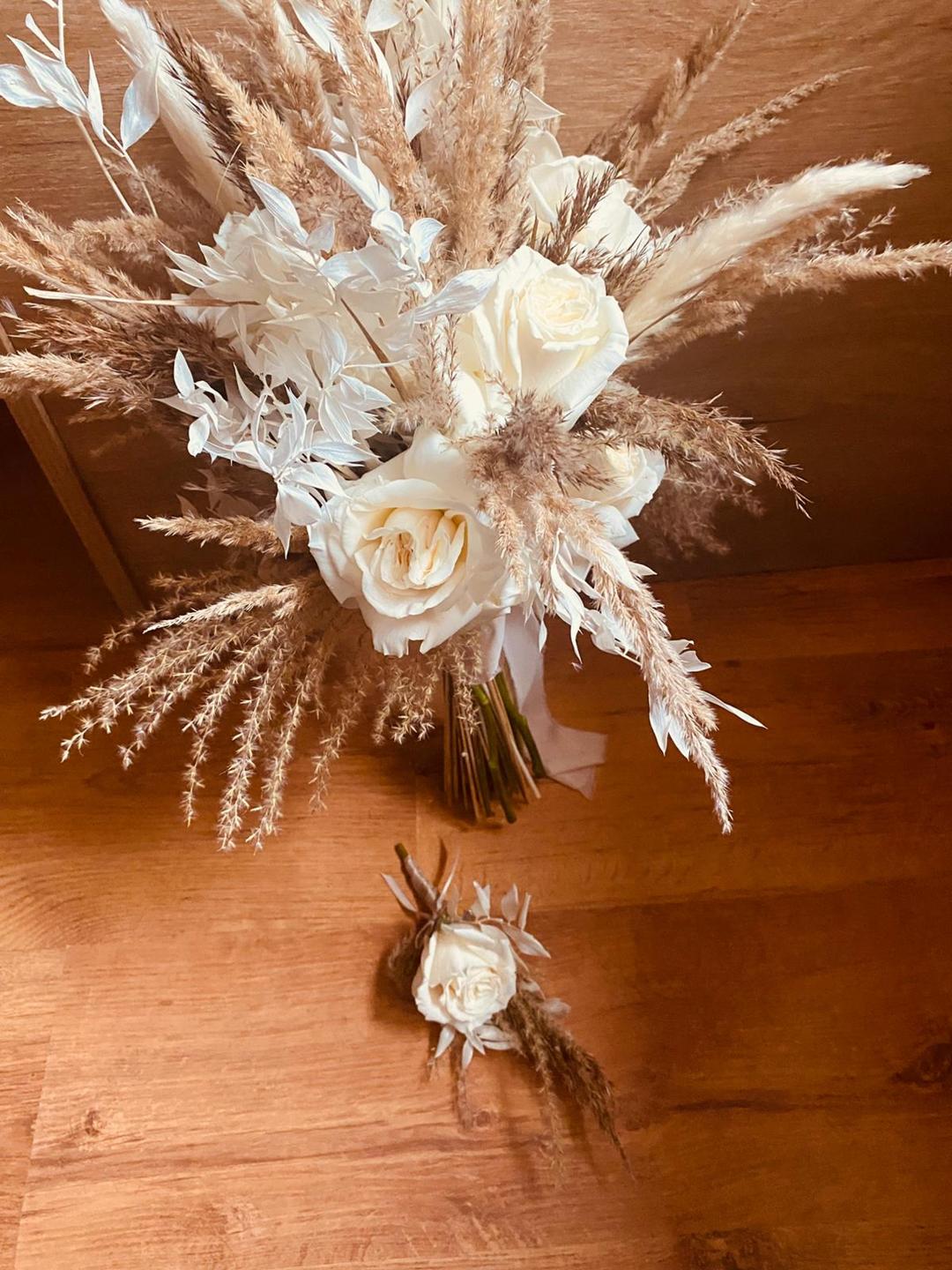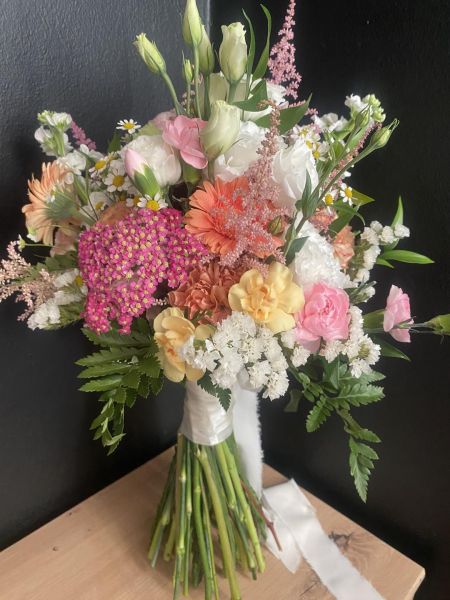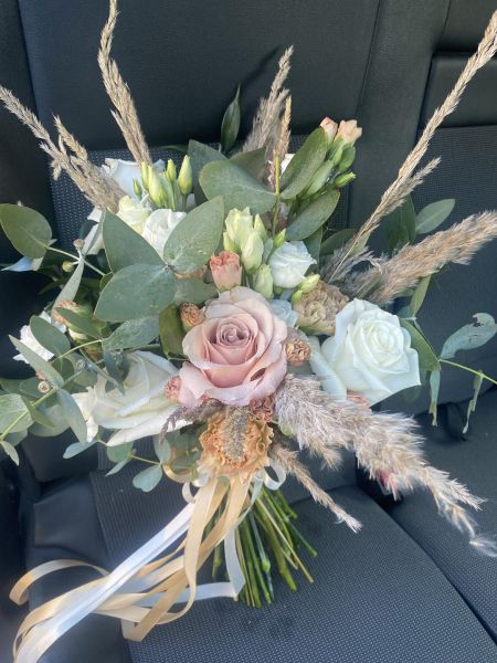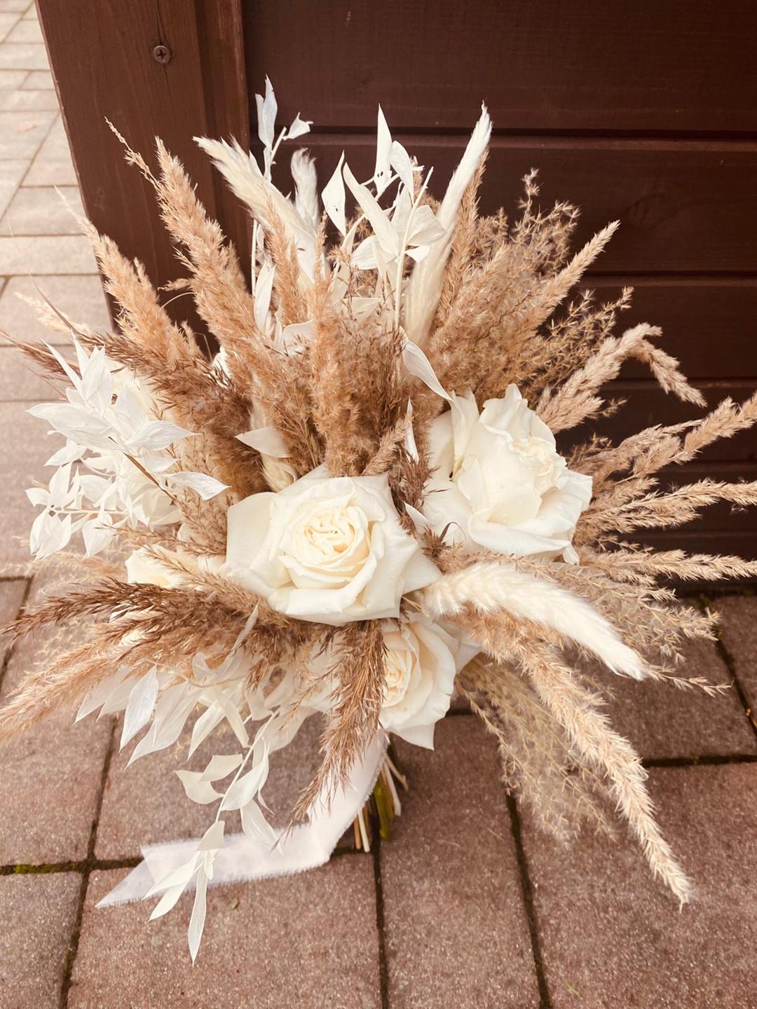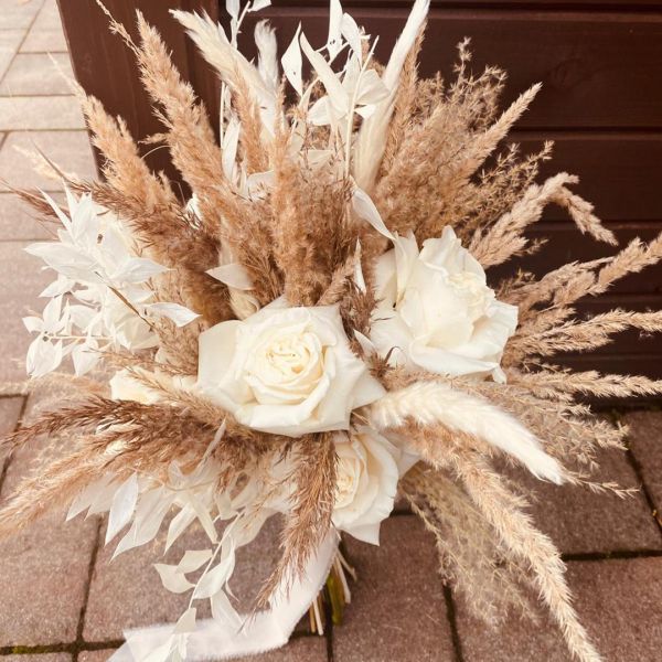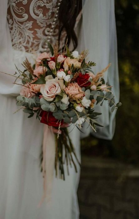 - bukiety w stylu boho - wiązanki luźne wykonane z kilku rodzajów kwiatów o nieregularnych kształtach i dużą ilością zielonych dodatków, które są obecnie bardzo popularne