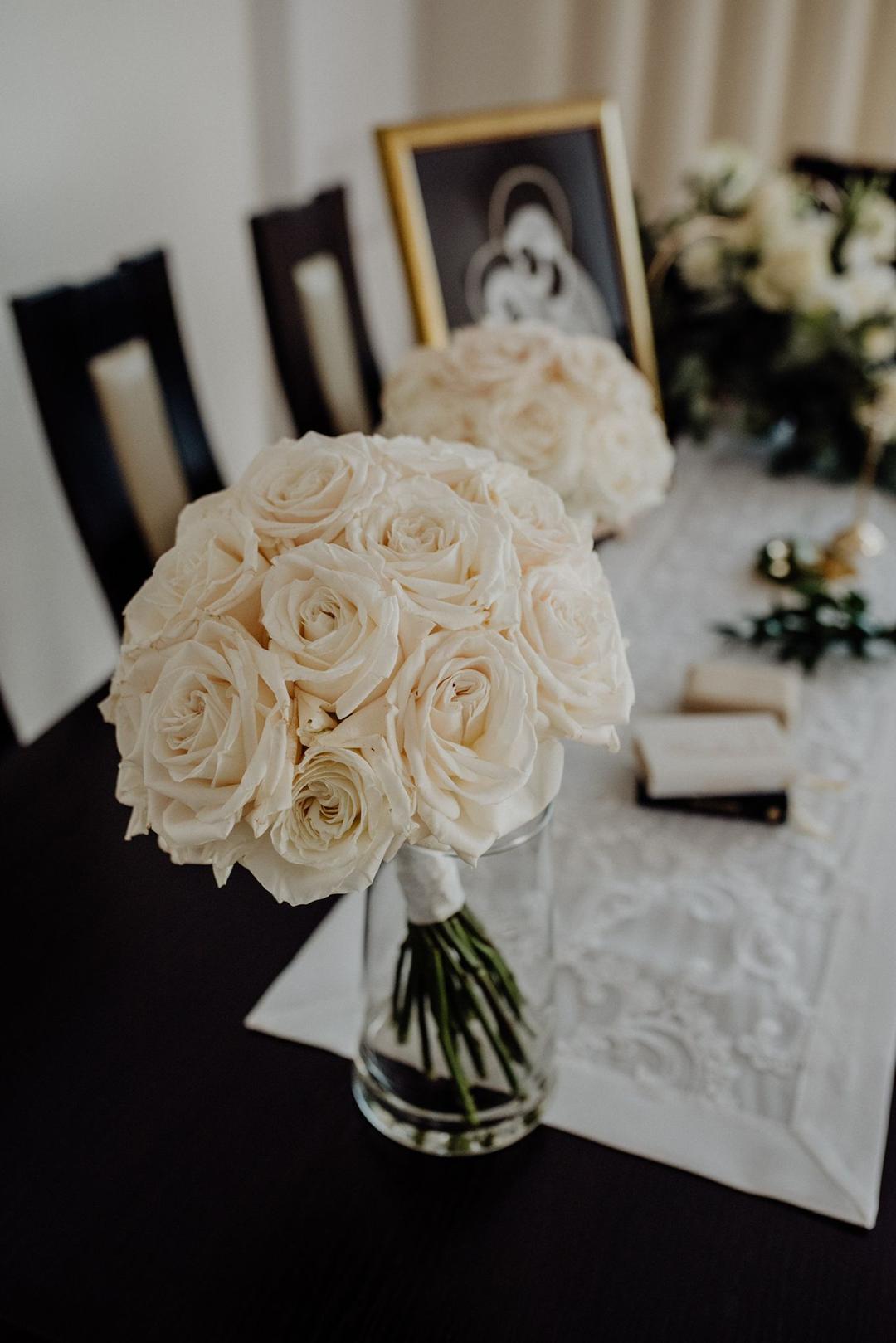 - okrągłe wiązanki typu biedermeier idealnie pasujące do stylu glamour,